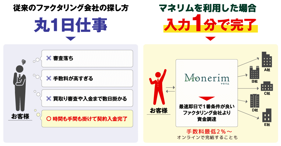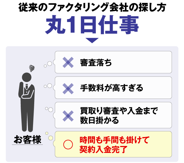 待てませんでした。そんな時にファクタリングを知りました。面倒な手続きもなく申し込んで翌日には口座に1,000万円が着金していました。とにかく速くて便利な資金調達手段だと思います。 -